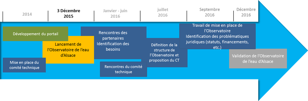 Septembre 2014 : mise en place d’un Comité Technique composé, dans un premier temps, de représentants de l’Agence de l’eau Rhin-Meuse, de la Région Alsace, des Conseils Départementaux du Bas-Rhin et du Haut-Rhin. D’autres partenaires seront invités à rejoindre ce Comité au cours de l’année 2016.