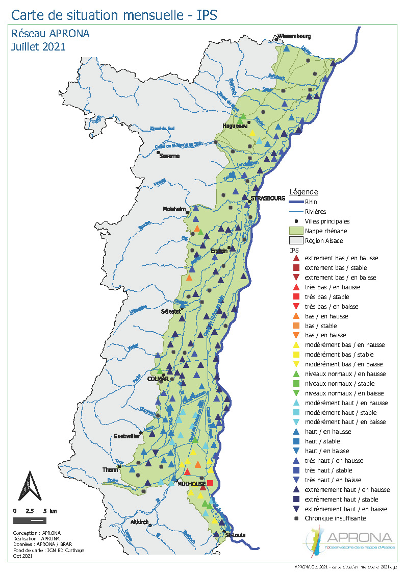Il se situe au premier rang des niveaux de nappe pour un mois de juillet dans le secteur du grand Ried, de la bande rhénane et sur certains ouvrages de la partie septentrionale de la nappe. A l'inverse, les niveaux restent sous les normales dans la partie Sud de la nappe.